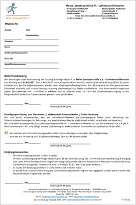 Mit diesem Formular können Sie "Meine Lohnsteuerhilfe e.V." beitreten, hier als pdf-Datei [388 KB] zum Ausdrucken: